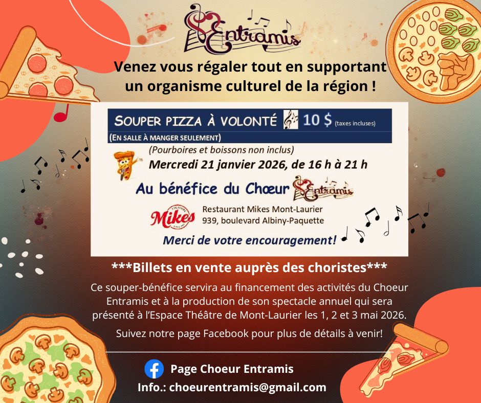 Le souper pizza Mikes du 22 janvier 2025 a remporté un grand succès, puisque plus de 500 repas ont été préparés et servis par l'équipe du restaurant Toujours Mikes de Mont-Laurier, aidée des choristes bénévoles du Choeur Entramis.
